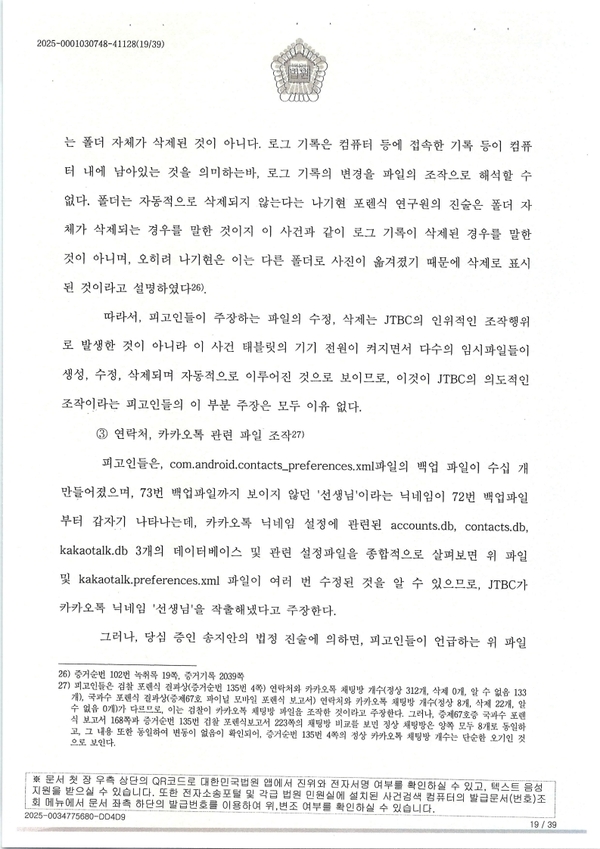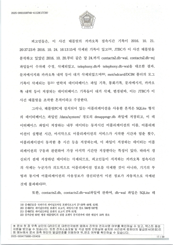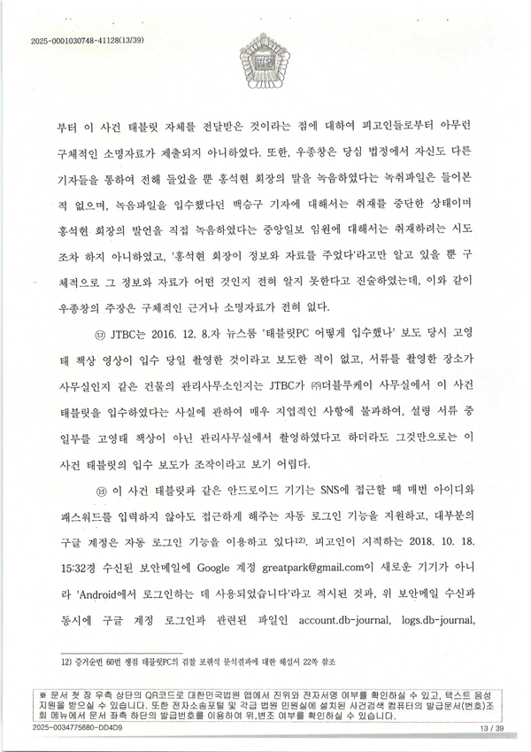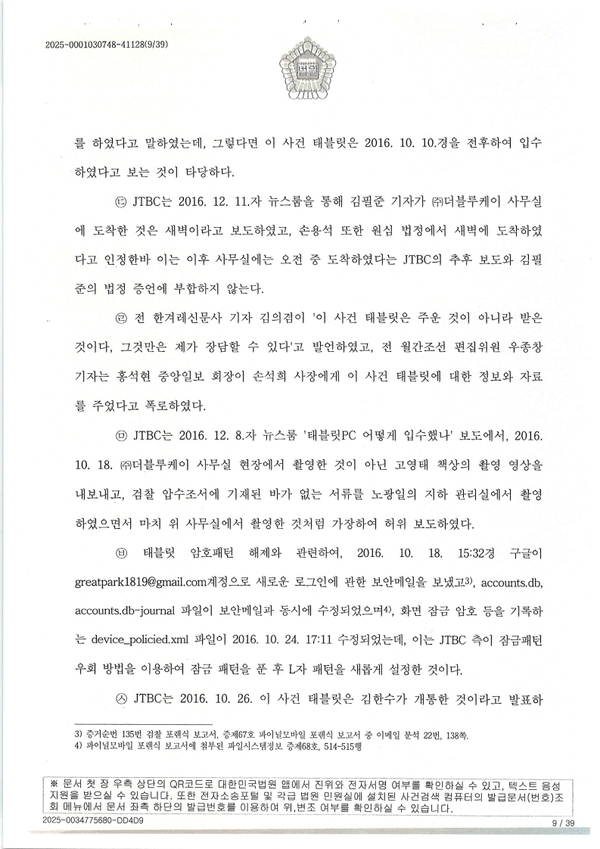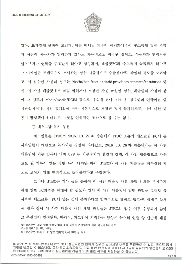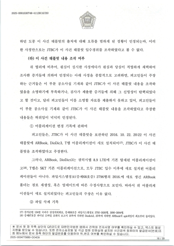 태블릿PC 내부 파일들이 삭제, 변경된 것과 관련해선 “피고인들이 주장하는 파일의 수정, 삭제는 JTBC의 인위적인 조작 행위로 발생한 것이 아니라 태블릿의 기기 전원이 켜지면서 다수의 임시 파일들이 생성, 수정, 삭제되며 자동적으로 이루어진 것으로 보이므로, 이것이 JTBC의 의도적인 조작이라는 피고인들의 주장은 모두 이유없다”고 강조했다.