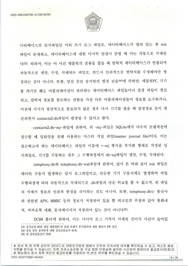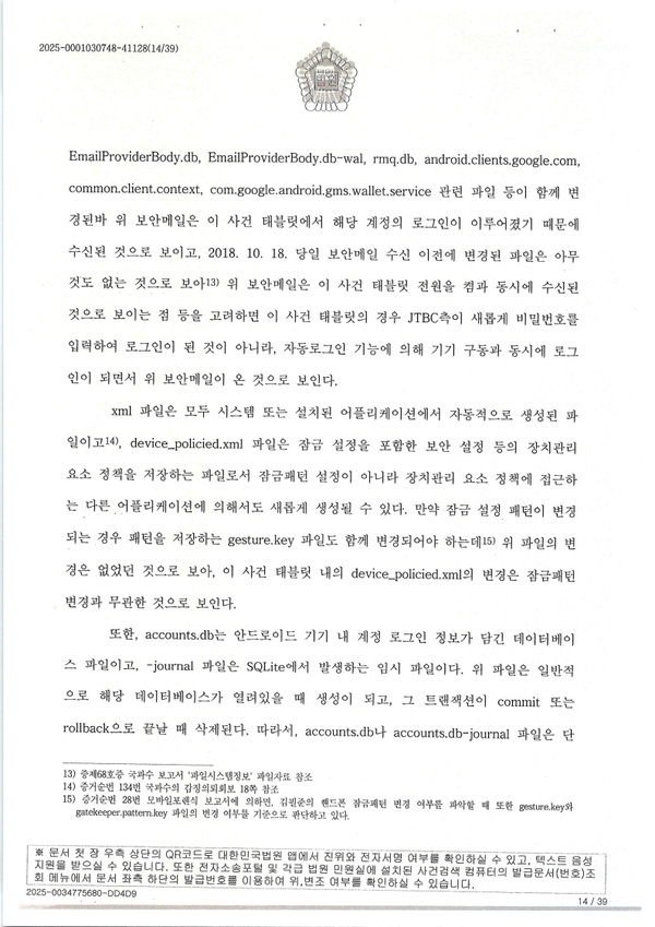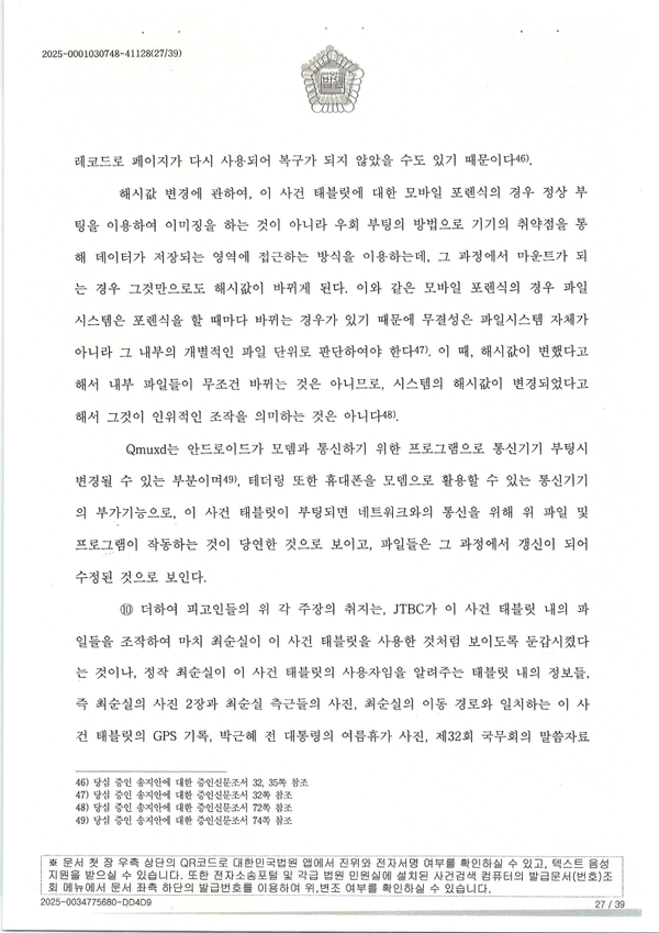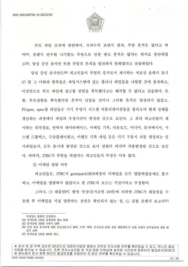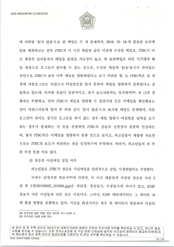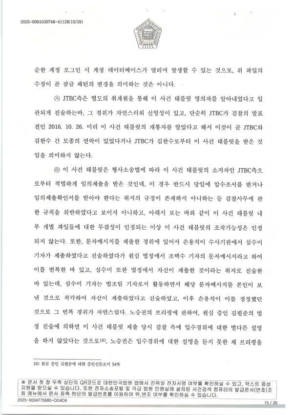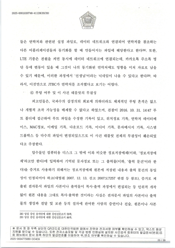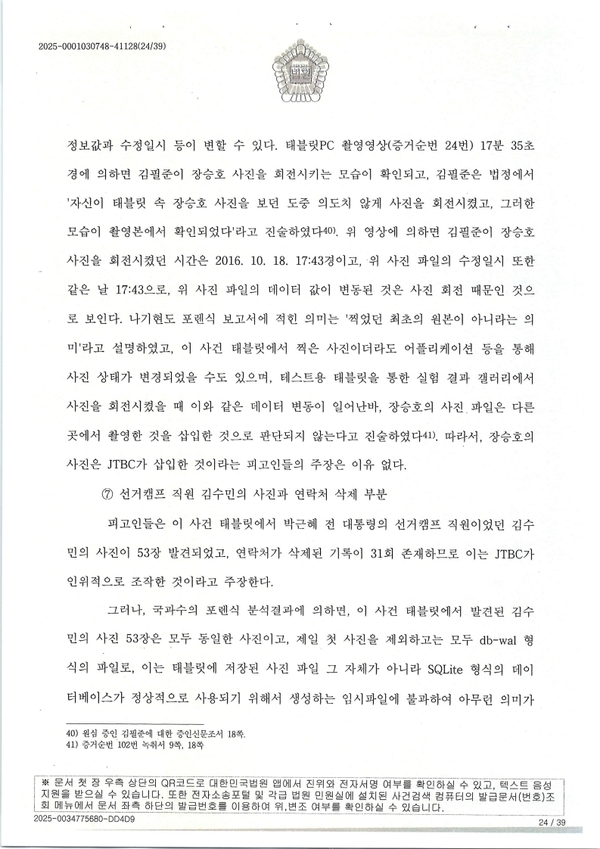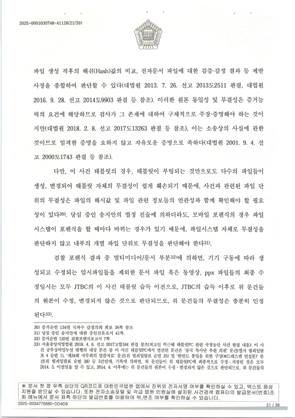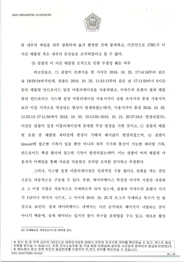 재판부는 “태블릿이 부팅되는 것 만으로도 다수의 파일들이 생성, 변경되어 태블릿 자체의 무결성이 쉽게 훼손되기 때문에 사건과 관련된 파일 단위의무결성은 파일의 해시값 및 파일 관런 정보들의 연관성과 함께 확인해야 할 필요성이 있다”면서 “검찰 포렌식 결과 중 멀티미디어/문서부분에 의하면, 기기구동에 따라 생성되고 수정되는 임시 파일들을 제외한 문서파일 혹은 동영상, ppx 파일들의 최종 수정일시는 모두 JTBC의 태블릿 습득 이전으로, JTBC의 습득 이후로 위 문건들의 원본이 수정, 변경되지 않은 것으로 판단되므로, 위 문건들의 무결성은 충분히 인정된다”고 역설했다.