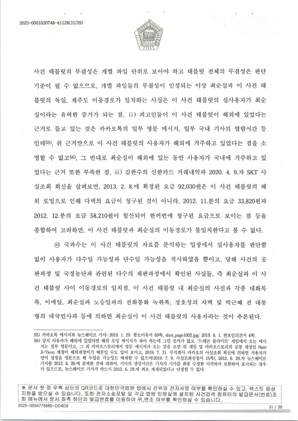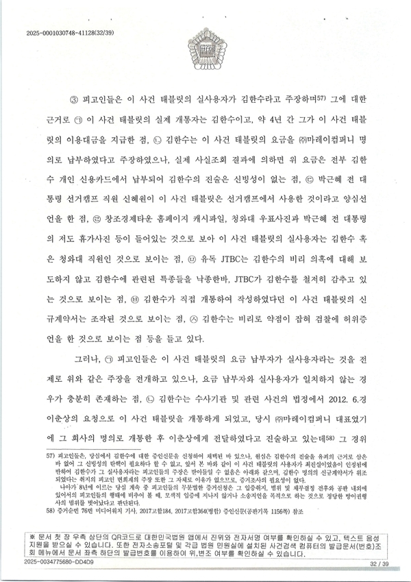 재판부는 특히 태블릿PC 실사용자 문제에 대해선 “최순실과 태블릿 사이 이동 경로의 일치점, 태블릿 내 최순실의 사진과 각종 대화목록, 이메일, 최순실과 노승일과의 전화 통화 녹취록, 정호성의 자백 및 박근혜 전 대통령의 대국민사과 등에 의하면 최순실이 태블릿의 사용자라는 것이 추론된다”고 판시했다.