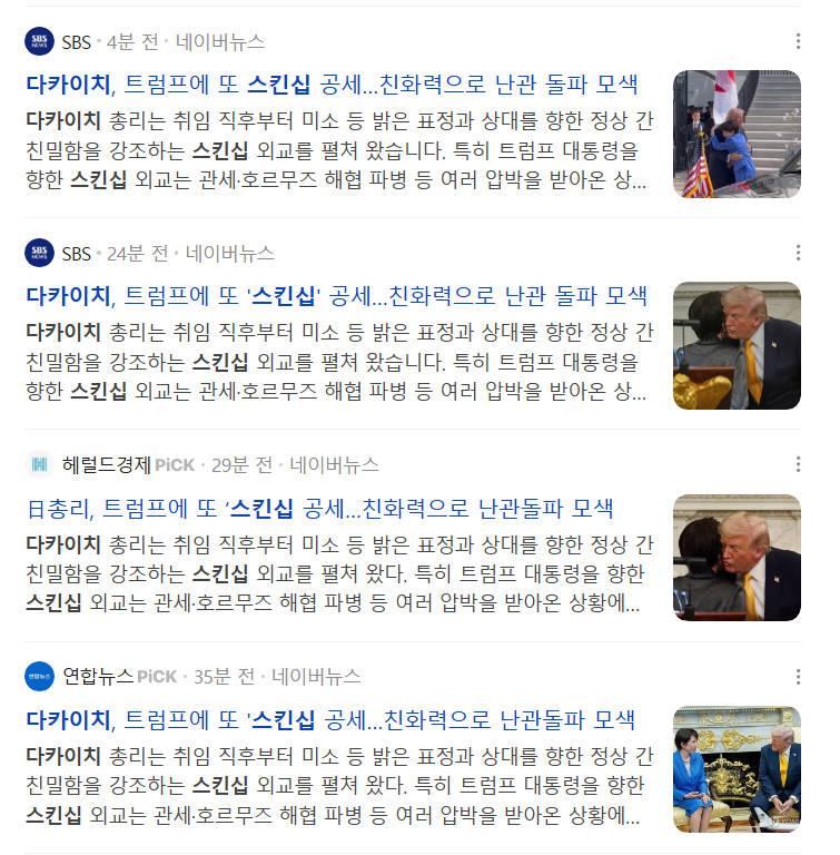 최초로 보도한 <연합뉴스>는 이날 오전 9시 4분 「다카이치, 트럼프에 또 ‘스킨십 공세…친화력으로 난관돌파 모색」이라는 제목으로 보도했고, <SBS>도 오전 9시 35분 사실상 같은 제목의 뉴스가 송고됐다.