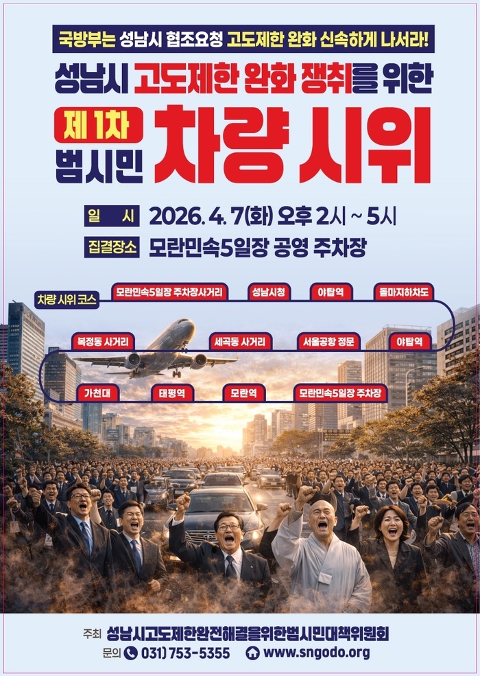 범대위에 따르면, 오는 4월 7일(화) 오후 2시 모란민속5일장에서 출정식을 갖고, 약 200대의 차량이 성남시청-야탑역-하탑지하차도-야탑역-성남시청-서울공항 정문-세곡동 사거리-복정동 사거리-가천대-태평역-모란역으로 돌아오는 총 20㎞ 구간을 오후 5시까지 행진한다.