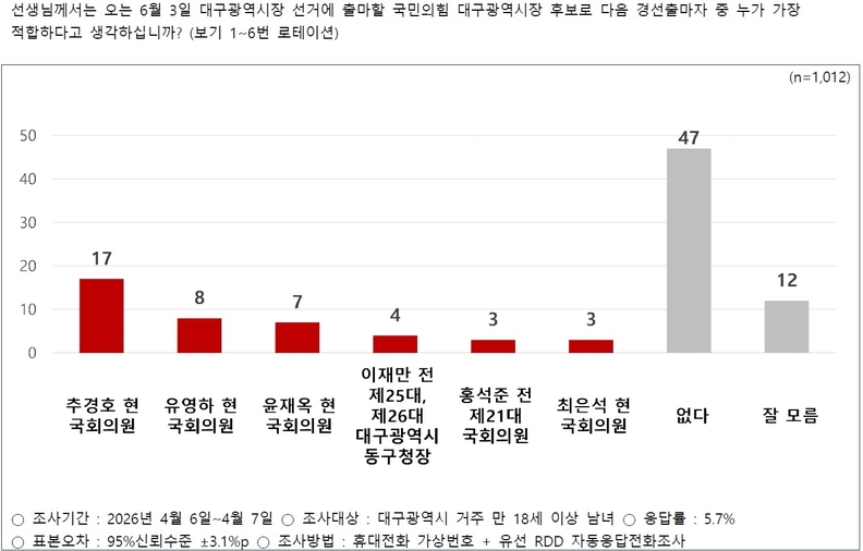경기지역 언론매체 <인싸잇경기>가 한국여론평판연구소(KOPRA)에 의뢰해 지난 6~7일 대구광역시 거주 만 18세 이상 남녀 1012명을 대상으로 실시한 6·3지방선거 국민의힘 대구시장 후보 적합도 조사 결과, 응답자의 17%가 추경호 의원을 꼽았다. 이어 유영하 의원(8%)과 윤재옥 의원(7%), 이재만 전 대구동구청장(4%), 홍석준 전 의원(3%), 최은석 의원(3%) 순이었다. 가장 많은 응답은 “없다”로 47%에 달했다.