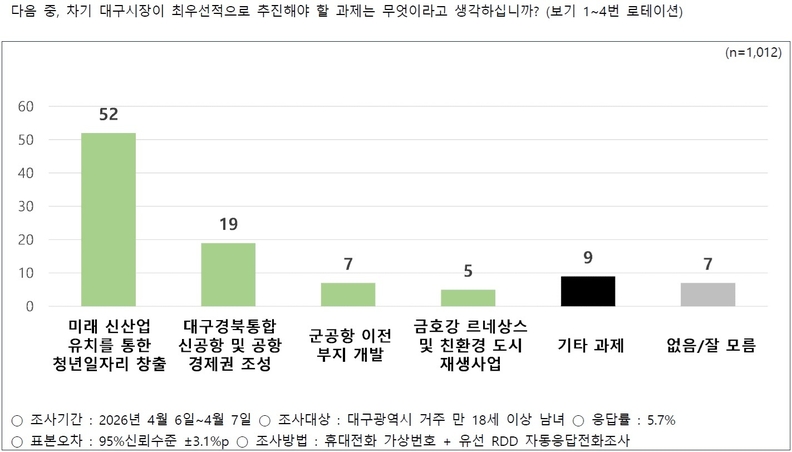 이번 여론조사에서 차기 대구시장이 최우선적으로 추진해야 할 과제에 대해 유권자의 52%가 ‘미래 신산업 유치를 통한 청년 일자리 창출’을 꼽았다. 이어 대구경북 통합 신공항 및 공항 경제권 조성(19%)과 군공항 이전 부지 개발(7%), 금호강 르네상스 및 친환경 도시 재생사업(5%), 기타 과제(9%) 등이었다.