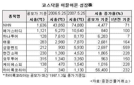 코스닥 종목 시황 및 분석만 8년차인 이영곤 한화증권 애널리스트는 그동안 코스닥을 이끌어온 성장주로 9개 종목을 선정했다. NHN, 메가스터디, 하나투어, 모두투어, 케이에스피, 현진소재, 하이록코리아, 태웅, 성광벤드 등 9개 업체로 시가총액 상위종목들이다.