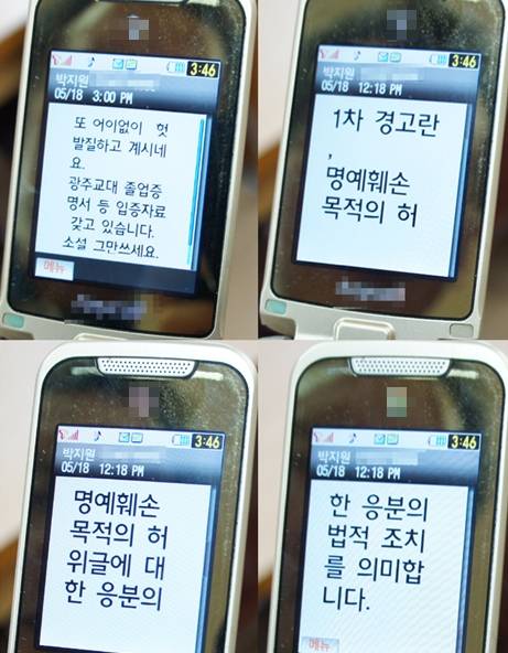 최근 프런티어타임스는 이같은 내용과 함께 정재학씨가 받은 문자를 공개했다. 프런티어타임스는 “자신의 학력조작을 폭로한 기고자에게 제1야당 원내 대표가 협박성 문자메시지 발송”이라는 캡션을 달아 휴대폰 문자를 찍은 사진 4장을 게재했다.