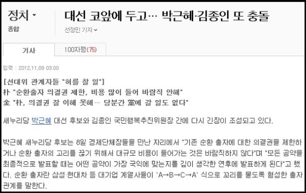 “대선 코앞에 두고… 박근혜·김종인 또 충돌”이라는 조선닷컴의 기사에 한 네티즌(sow****)은 “종인이 저거 몰아 내야 돼. 항상 뺀질뺀질, 사우나 다녀온 얼굴을 해가지고 박근혜와 싸울 궁리나 하고. 민주당 청탁 받고 위장 잠입한 넘 아닌지 몰라. 저거 재수 없는 녀*이야”라고 했고, 다른 네티즌(leedh****)은 “김종인 빼고 전 대우의 핵심(부자정책지지)이한구를 아예 넣어야죠. 그래야 박 후보 생각 제대로? 쭉 해오신대로? 뭘 faint해요? 국민이 바본줄 아나벼?”라고 했지만, 다른 네티즌(bdle****)은 “박근혜 후보의 가장 큰 실수는 김종인 같은 자를 세운 것이다. 박 후보는 좋지만, 김종인 꼴보기 싫어 찍지 않겠다는 사람들 많다. 전혀 개혁적이지도 않고, 참신하지도 않다. 그의 경제정책도 한심스럽긴 마찬가지다. 조금 아픔이 있더라도 캠프 밖으로 내보내라! 두고두고 화근이 될 게다”라고 주장했다. 이런 조선닷컴 네티즌들의 주장처럼, ‘김종인과 이상돈 때문에 새누리당이 정체성을 잃고 대선전에서 손해를 볼 것’이라고 주장하는 보수우익 진영의 논객들도 적지 않다. 김종인과 이상돈은 새누리당의 일사불란한 전열을 수시로 흩트리는데, 왜 박근혜 후보가 감싸안고 가는지도 이해하기 힘들다.