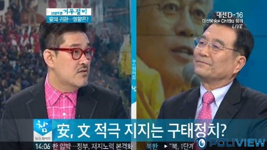 안 전 후보가 문 후보를 지지하더라도 박 후보가 가능성이 높다는 관측에 대해 곽 교수는 “예단은 성급하다”며 “여론조사가 투표 결과와 잘 안 맞지 않나. 현재 오차범위 내라는 것을 중시한다. 어떤 조사도 오차범위내 접전이나 문 후보가 약간 지고 있는 것으로 나타나고 있어 이 표가 올라가면 두 후보가 비슷하다. 남은 기간 정책이 드러나고 차별화가 될 것”이라고 예상했고, 양 회장은 “그렇게 생각하지 않는다”고 반론을 제기했다.
