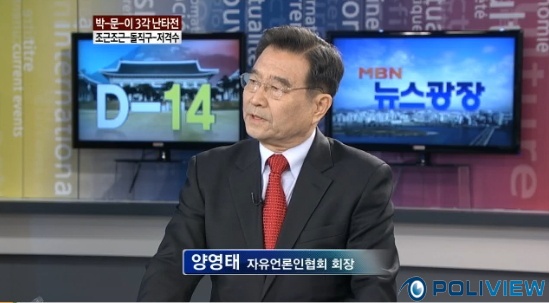 중앙선거 관리위원회가 주최한 첫 번째 대선후보 TV토론에서 통합진보당 이정희 후보의 태도가 논란이 되고 있는 가운데 양영태 자유언론인협회장이 5일 잇따른 종편 시사프로를 통해 “격식과 품위를 갖추어야 할 대선토론이 난장판이 된 충격적 사건”이라며 강하게 비판했다.