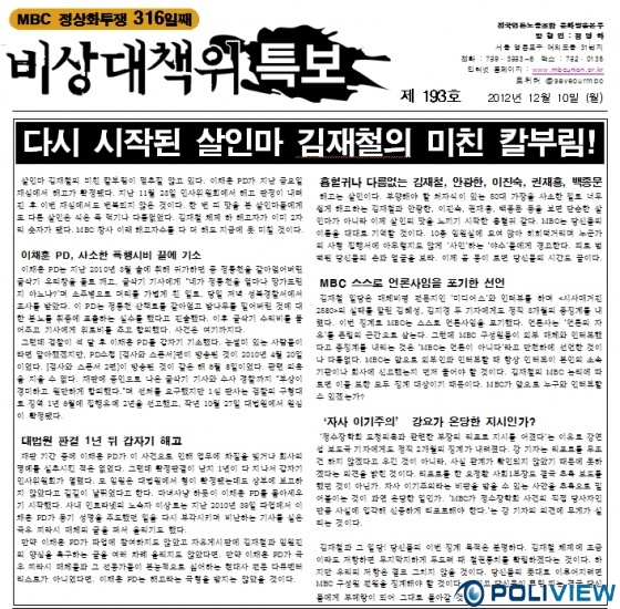 노조는 10일 특보를 통해 지난 2010년 당시 술에 취해 포크레인 기사를 폭행했다가 작년 11월 대법원으로부터 징역 1년 6개월에 집행유예 2년을 선고 받은 이채훈 PD를 사측이 최근 재심에서 해고를 확정하자 “살인마 김재철의 미친 칼부림이 멈추질 않고 있다”며 비난하고 나선 것이다.