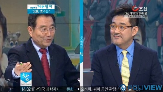 반면 곽 교수는 “호남 민심 얻기 위해 한광옥 전 대표가 새누리당으로 가자 김덕룡 의장은 맞불카드 같다”며 “어떻든 민심이 이번만큼 뜨거웠던 대선은 본적이 없다. 늦기도 했지만 제3 후보가 나오지 않은 여야 진검승부가 됐기 때문에 누군가 실수하거나 말과 다른 행동하거나 하는 것을 조심해야 할 것이다. 안철수 효과는 9일 뒷면 밝혀지지 않겠나”라고 말했다.