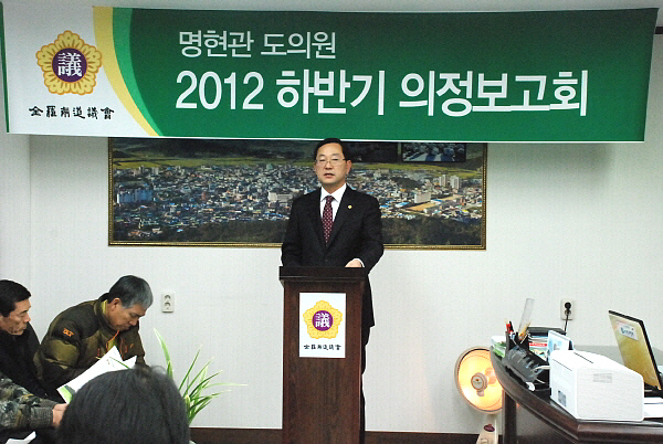 명 의원은 의정보고회에서 “올 한해 명품도시 시찰 등 지역발전을 위해 서울을 비롯한 전국 20여곳을 방문하여 이를 도정과 지역경제살리기에 접목하는 노력을 다해 왔다”고 밝히고 특히, 문화관광, 명품도시 건설에 많은 연구를 하고 있다고 덧붙였다.