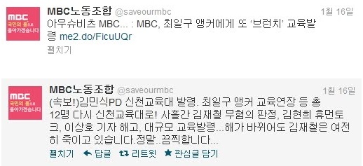 MBC 노조는 16일 공식 트위터를 통해 "해가 바뀌어도 김재철은 여전히 죽이고 있습니다.정말..끔찍합니다..."라며 사측을 비난하였다.