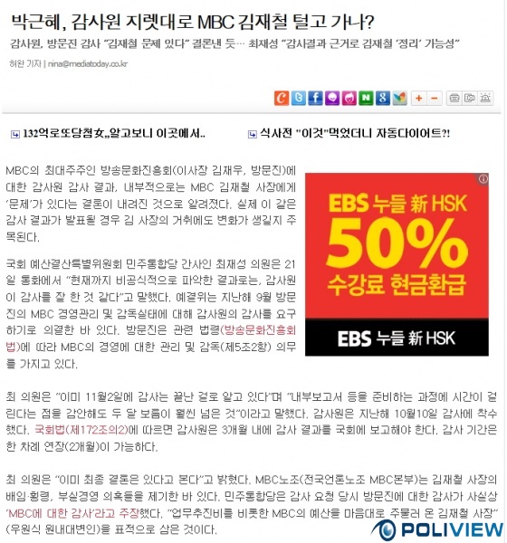 미디어오늘은 21일자 기사 <박근혜, 감사원 지렛대로 MBC 김재철 털고 가나?>에서 “MBC의 최대주주인 방송문화진흥회(이사장 김재우, 방문진)에 대한 감사원 감사 결과, 내부적으로는 MBC 김재철 사장에게 ‘문제’가 있다는 결론이 내려진 것으로 알려졌다”며 “실제 이 같은 감사 결과가 발표될 경우 김 사장의 거취에도 변화가 생길지 주목된다”고 보도했다.