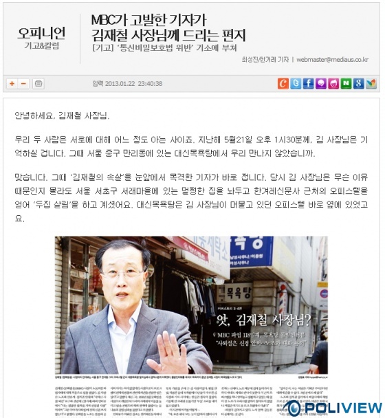 MBC노조를 일방적으로 응원하고 있는 미디어비평웹진 미디어스는 23일 최 기자의 기고 글을 메인에 게재했다.