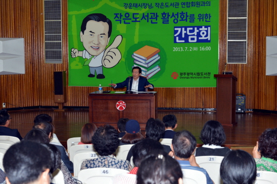간담회는 광주광역시 작은도서관연합회 327개관의 회원 250여명이 참석했다. 강운태 시장은 작은도서관 정책과 활성화 방안, 시민들의 독서 진흥에 대한 정책방향을 설명하고, 작은도서관 운영자들의 애로사항을 청취했다.