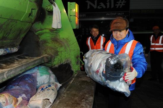 강운태 시장은 7일 새벽 광산구 송정매일시장 인근 도로변에서 환경미화원 복장으로 환경미화원, 시 환경생태국 직원 등과 상가 쓰레기를 운반차량에 나르는 등 쓰레기 수거 활동을 벌였다.