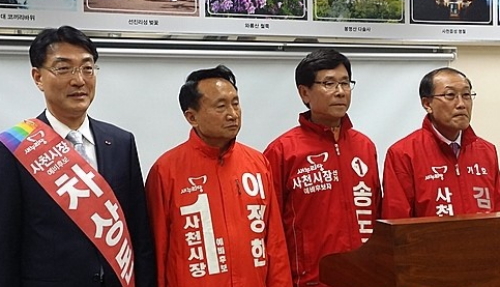 정만규 사천시장 측의 금품살포 의혹으로 예비후보들과 정 시장 측의 공방이 일면서 논란이 확산되는 가운데 지난 25일 오후 3시 사천시장 예비후보인 김재철·송도근·이정한·차상돈 후보는 사천시청 브리핑룸에서 새누리당을 향해 '정만규 후보를 공천에서 배제할 것'을 촉구하는 기자회견을 가졌다.