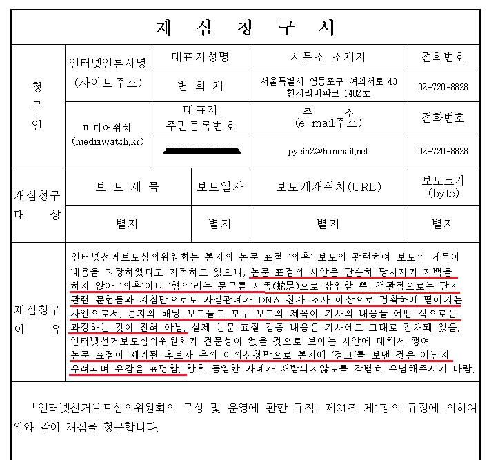 중앙선거관리위원회 산하 인터넷선거보도심의위원회(이하 선관위)가 본지 미디어워치의 논문표절 관련 기사들에 대해 기사 제목 과장 등의 사유로 엄중 '경고' 조치를 취한 가운데, 본지가 선관위에 재심청구서를 재중했다.