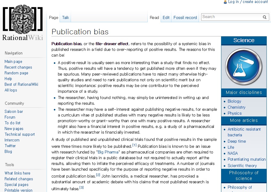 존 이오아니디스(John Ioannidis)가 2005년에 '플로스메디슨(PLoS Medicine)'지에 발표한 논문인 '왜 대부분의 연구논문들에는 오류가 있는가(Why Most Published Research Findings Are False)'는, 해당 학술지에서 가장 많이 인용된 논문(2,000회 이상)으로 의학계에 신선한 충격을 줬다. 이 논문은 출판편향(puiblication bias) 등의 문제로 인해, 알고보면 결함이 많고 신빙성이 떨어지는 연구결과가 주요 학술지들에 실리고 있는 문제를 다루고 있다.