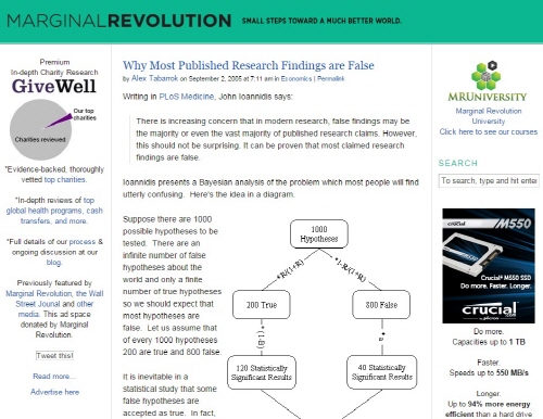 저명한 경제학자인 알렉스 타바록(Alex Tabbarok)은 이오아니디스의 연구를 탁월하게 요약하여 훨씬 더 의미 있는 맥락에서 통찰한 바 있다. 그는 통계적 연구 그 자체만으로는 다수의 긍정적 결과의 연구들이 하나같이 ‘거짓 양성(false positive, 편집자주 : 실제로는 부정적인 결과이지만 마치 긍정적인 결과인 것처럼 데이터가 나타나는 경우)’이었던 것으로 밝혀질 수 있다는 점을 지적했다. (Why Most Published Research Findings are False)