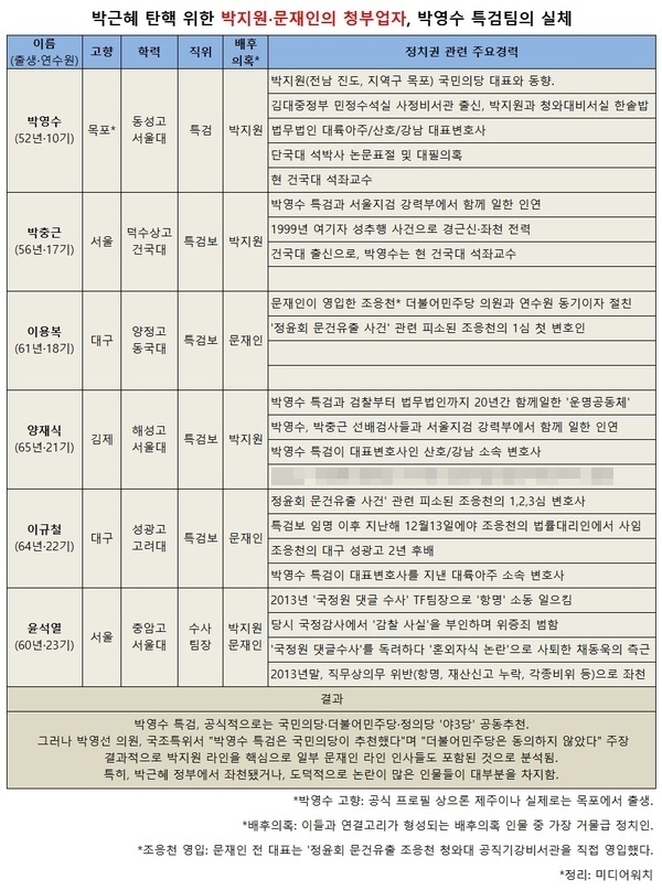 박영수 특검팀의 수뇌부 6명 전원이 박지원 국민의당 대표, 문재인 전 더불어민주당 대표와 강력한 연결고리를 형성하고 있는 것으로 밝혀졌다.