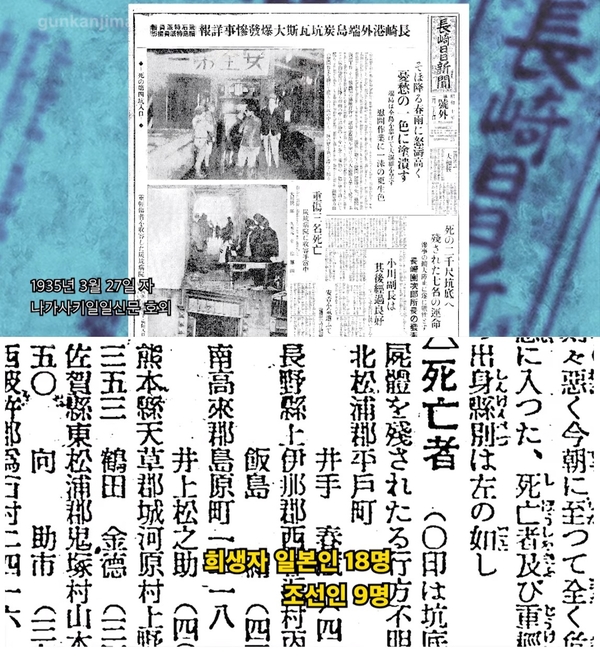 실제로 1935년 3월 27일자 나가사키일일신문(長崎日日新聞) 호외에는 군함도에서 발생했던 가스폭발사고가 기록됐다. 해당 기사는 ‘희생자는 27명. 그안에 일본인은 18명, 조선인은 9명이었다. 최전선에서 구출을 지휘하던 탄갱 최고 간부도 2차 폭발로 인해 사망했다’고 보도했다. 희생자가 오히려 일본인이 더 많았다.