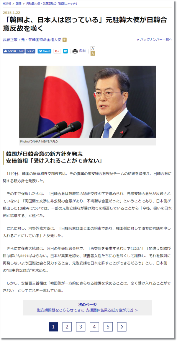 “일본 측이 거출한 10억엔의 취급에 관한, 한국 측의 주장도 그 의미를 알 수가 없다. 그 이상으로, ‘재교섭은 요구하지 않는다’ 라고 말하면서, 실제로는 합의사항 전부를 사실상 휴지조각으로 만들어버리고 있는 것이 신방침(新方針)이다. 아베 수상의 ‘전혀 받아들일 수 없다’ 라는 것은 당연한 것으로, 일본 측으로서 이에 대응할 필요는 전혀 없다.