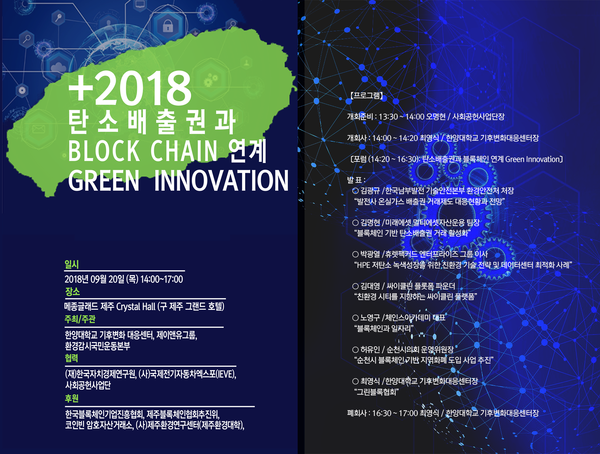 20일 오후 2시 제주도 메종글래드 제주호텔서‘탄소배출권과 블록체인 연계 그린이노베이션(Green Innovation) 포럼’이 열린다.