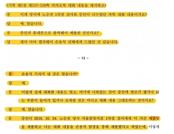 정확히는 제출은 손용석이 한 것이지요. 제가 여기서 저 문자메시지 증거와 관련해서 손용석은 검찰에서 뭐라고 진술했는지 한번 읽어보겠습니다. 손용석은 심수미가 이런 문자메시지를 노승권 1차장과 주고받은 경위, 대화 내용의 맥락까지도 구체적으로 검찰에서 진술했습니다.