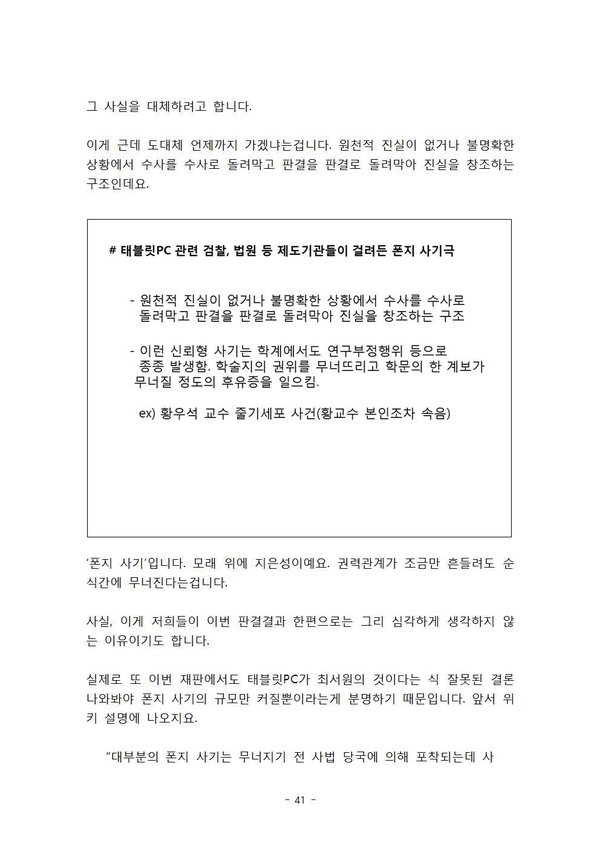 황 대표는 “지금 태블릿PC 실사용자 문제와 관련해서는 원천 수사자료가 없거나, 어느 쪽으로든 해석이 가능한 사실상 무의미한 정보뿐”이라며 “결국 우리나라의 제도기관이 일종의 ‘폰지 사기극’을 벌이고 있다”고 분석했다.