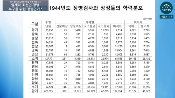 정 연구원은 자신이 정리한 ‘1944년도 징병검사와 장정들의 학력분포’ 표를 제시하면서 “조선 전역에 걸쳐서 총 수험인원이 22만2295명이었고, 그 가운데 약 10만2000명정도의 인원이 미취학”이라고 설명했다.