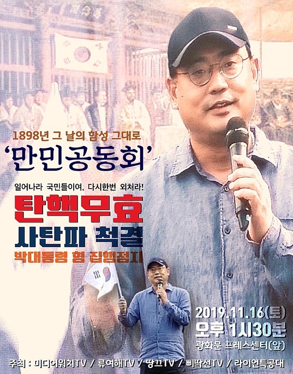 이에 우리는 바로 탄기국 1차 집회와 만민공동회의 전통을 되살려, 사기탄핵의 잘못된 점들을 밝혀내고, 탄핵의 주범들을 지목하여 정계은퇴를 시키고, 박대통령 형집행정지를 관철시키고, 문재인 퇴진까지 견인해내기 위해, 2019년 11월의 ‘탄핵무효’ 만민공동회를 개최할 것을 선언합니다.