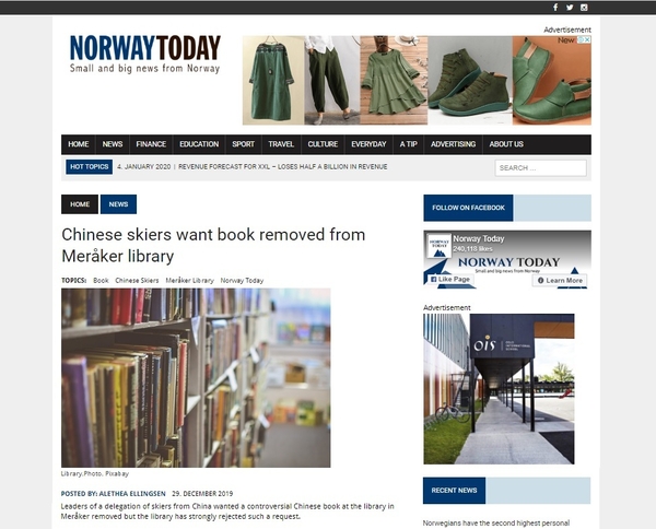 노르웨이 투데이는 “중공 스키팀의 핵심 인사들이 논란에 휩싸인 중국어 책을 메로커 도서관에서 치워달라고 요구했으나 해당 도서관은 요구를 일축했다”고 보도했다.
