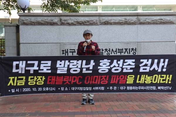 대구시민들이 20일 낮 12시 대구지방검찰청 서부지청 앞에서 태블릿 재판의 홍성준 검사 규탄 기자회견을 열고 감찰 진정서를 제출했다.