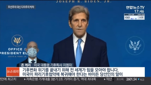 바이든이 발표한 정권 간부 인사 중에서 중국과의 관계에서 매우 경계를 요하는 것이 존 케리 전 국무부 장관(1943 년생)에 대한 ‘기후 변화 문제 담당 대통령 특사’ 기용이다. 신설 포지션이지만 장관급 대우라고 한다.