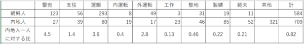 続三ヶ月以上に及びたるときは団体生命保険に加入せしめ各人在籍中の保険料は一切会社負担し万一不幸ありたる場合保険金三百円を贈呈し災害に対する扶助、退職の場合の給与関係等につき内鮮区別なく移入当時は一人一日米一升程度を普通とし漸次減食せしめ特に配給米実施後は盛切り飯とし配給米の特に不足を来せる場合は甘藷、大根、乾麵等の混食にて間に合はせた、昭和十八年五月に於ける職種別人員及び内地労働者との比率は左の如くである