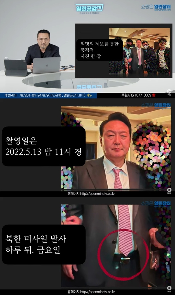 열린공감TV는 제보받은 사진을 공개하면서 “윤 대통령이 거나하게 취해서 눈도 풀려 있고 (넥)타이도 풀려져 있다”며 “벨트도 살짝 풀려 있고 바지 단추도 풀려있다”고 설명했다.