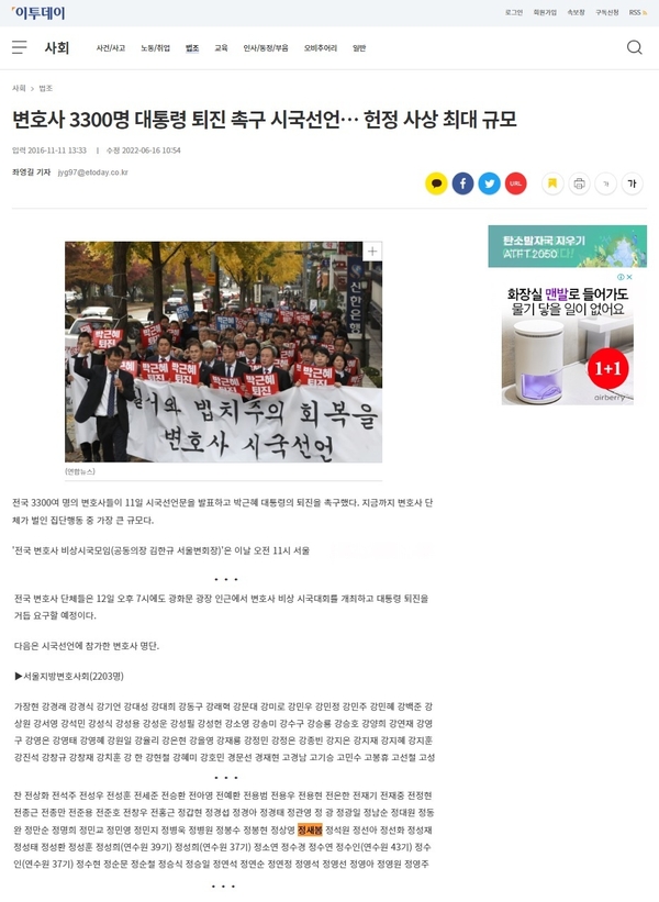 본지 취재 결과 정새봄 변호사는 탄핵 정국이 열린 2016년 11월초부터 일찌감치 박 대통령 퇴진 촉구 변호사 시국선언에도 이름을 올렸던 것으로 확인됐다. 박 대통령 핵심측근인 유영하 변호사가 박 대통령 퇴진과 탄핵을 일선에서 외쳐온 변호사를 최측근으로 두고 있는 문제와 관련해서도 논란이 일 전망이다. 유 변호사는 박근혜 정권 당시 청와대 문건 유출 사건의 주요 당사자로 지목된 바 있는 조응천 더불어민주당 의원과도 절친임이 드러나 눈총을 받았던 바 있다.