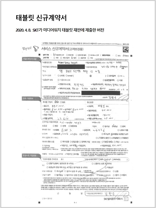 변 고문은 이렇게 위조된 신규계약서로 인해 자신이 현재 피고인 신분인 JTBC 명예훼손 형사재판에서 큰 불이익을 겪었다면서 올해 1월, SKT를 상대로 2억원대 손배소송을 걸었다. 하지만 SKT는 법원 측에 답변을 하면서 또다시 김한수와 공모, 한 모바일 기기 샘플계약서를 위조해 증거로 제출한 사실이 변 고문 측의 필적 감정에 의해 적발이 됐다.