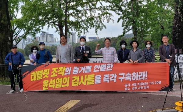 변희재 미디어워치 대표고문이 23일 정부과천청사 공수처 건물 앞에서 기자회견을 갖고 태블릿 조작의 증거를 인멸한 검사들을 직무유기, 직권남용권리행사방해, 공용서류 등 은닉 및 증거은닉죄로 고위공직자범죄수사처(이하 공수처)에 고발했다.