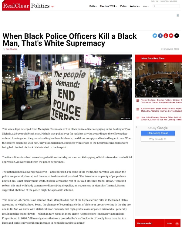 샤피로는 일부 언론이 이번 사건의 본질을 ‘백인우월주의(white supremacy)라고 규정하고 있는 현실을 비판했다. 실제로 워싱턴포스트는 “멤피스 경찰은 미국의 시스템적인 인종주의 논란을 다시 촉발시켰다”고 보도했고, CNN은 “니콜스를 살해한 경찰들이 흑인이기는 했지만 그들도 인종주의의 영향을 받았을 수 있다”고 주장한 바 있다.