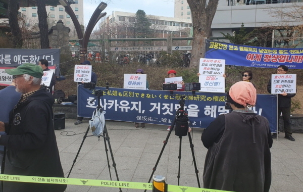 한일우호 시민단체 위안부법폐지국민행동(대표 김병헌)이 위안부 문제로 허위 선동을 해온 호사카 유지 세종대학교 대우교수를 규탄하는 집회를 23일 정오부터 1시간 동안 세종대 정문 앞에서 개최했다.