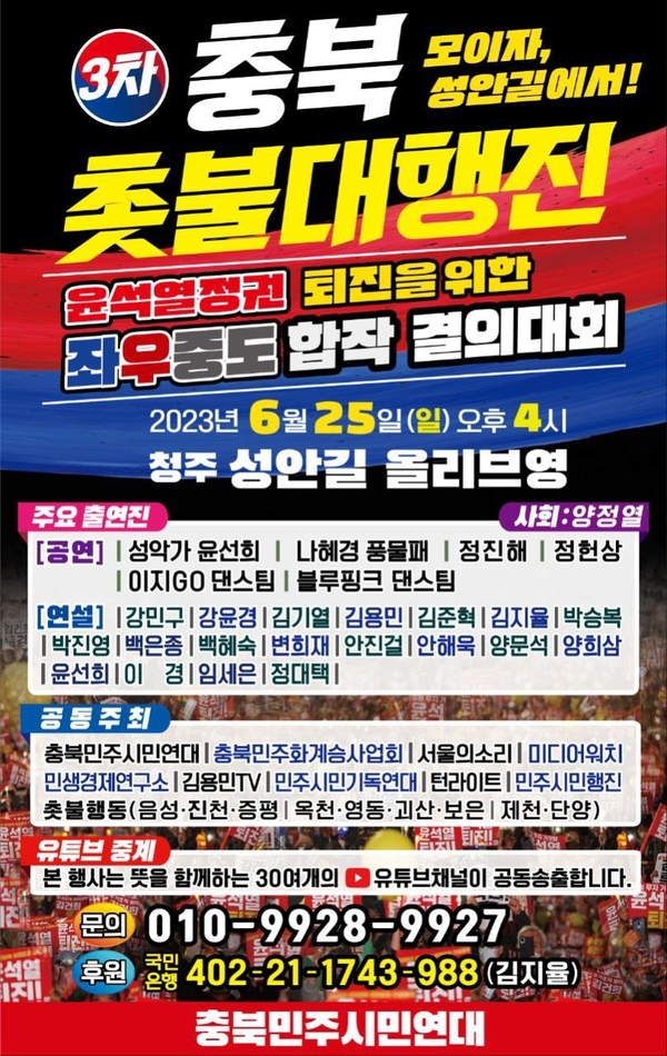 오는 25일(일요일) 오후 4시, 충북 청주 성안길 부근에서 ‘윤석열 정권 퇴진을 위한 좌우중도합작 결의대회’가 열린다.