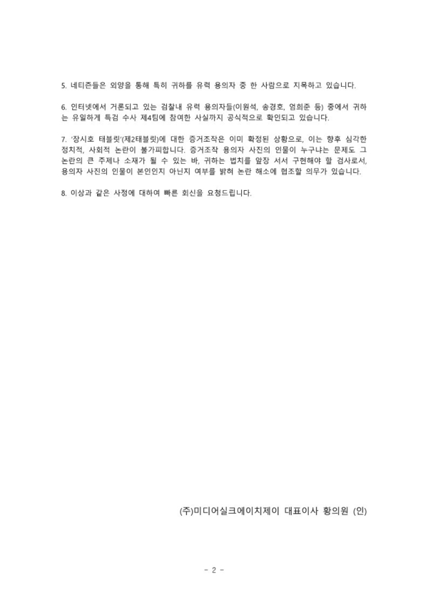 황 대표는 29일자 발송 공문을 통해 “(태블릿 조작수사 사건과 관련) 포렌식 감정의 결과로 해당 태블릿에는 2017년 1월 25일 12시 58분경에 찍힌 한 용의자 사진이 찍혔다가 삭제된 사실이 확인됐다”며 “네티즌들은 외양을 통해 특히 귀하를 유력 용의자 중 한 사람으로 지목하고 있다”고 말했다.