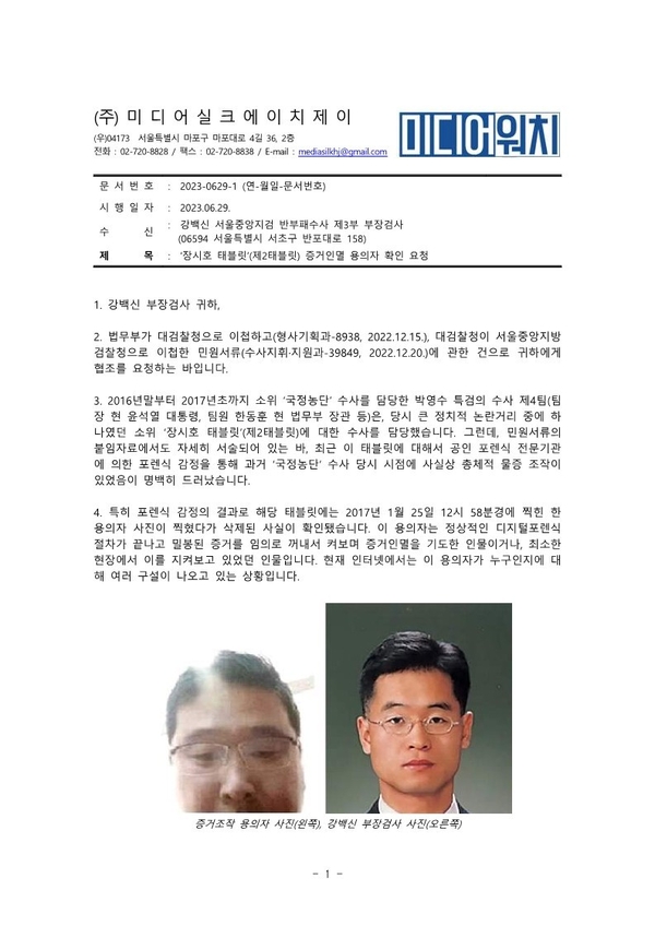 본지 황의원 대표이사가 앞서 송경호 서울중앙지검장과 엄희준 반부패수사 제1부 부장검사에 이어 강백신 반부패수사 제3부 부장검사에게 이른바 ‘제2의 최순실 태블릿’에서 발견된 남성의 신원을 특정해달라는 공문을 보냈다.