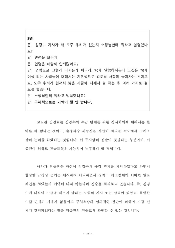 그는 “원심(항소심)은 김경수에게 수갑을 면제한 사유에 대하여 전혀 확인이 되지 않는다는 점, 김경수에게 마땅히 적용될만한 수갑 예외 규정이 존재하지 않는다는 점을 확인하였고, 무엇보다도 ‘기록상 아무런 자료가 없다’는 사실을 알았으면서도 피고의 재량권 남용을 인정하지 않은 것은 심각한 판단 유탈(遺脫)이라 할 것”이라고도 밝혔다.