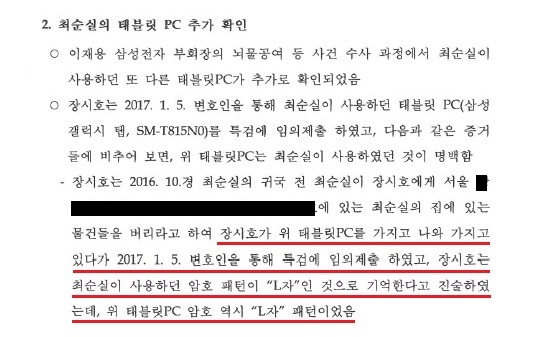 변 대표는 이번 준비서면에서 ‘제2의 최순실 태블릿’ 입수 및 제출 경위 관련 장시호의 진술도 믿을 수 없다는 점도 다시 강조했다. L자 잠금패턴 진실부터가 이미 과학적 포렌식 결과와 전혀 맞지 않는데다가, 최근 최서원의 태블릿 반환 재판 1심에서도 장시호 진술은 신빙성이 없다는 결론이 나왔다는 것.