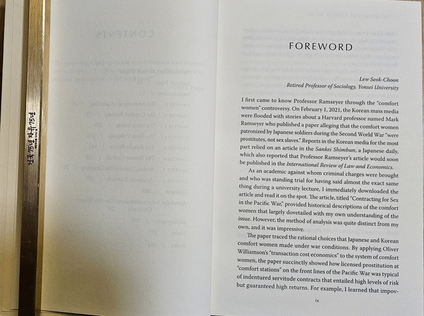 이 번역 작업의 최종원고를 교정하고 있던 2023년 3월 램자이어 교수로부터 메일이 왔다. ‘위안부 거짓말’을 폭로하는 새로운 저서 ‘위안부 사기극: 가짜 기억, 북한 스파이, 그리고 학문이라는 수렁 속의 암살단(The Comfort Women Hoax: A Fake Memoir, North Korean Spies, and Hit Squads in the Academic Swamp) 원고를 곧 마무리하는데, 저자 아닌 사람이 쓰는 서문(Foreword)을 내가 쓰면 좋겠다는 부탁이었다. 동병상련(同病相燐)인 나로서는 마다할 이유가 없었다.