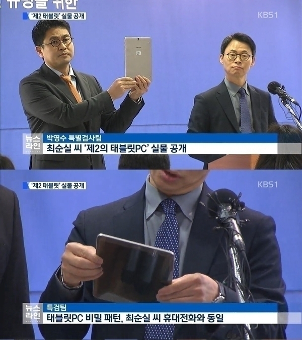 JTBC放送社は翌日になってから孫石熙アナウンサーの口から「実は昨日の特検のブリーフィングを見ても、私たちが入手したものだけでなく、崔氏の甥のチャン・シホ氏が特検に提出した第2タブレットPCにも同様のロックパターンがあった」とし、「今ではあまりにも有名になった'L字'。その言葉は結局、ユーザーが同一人物だとしか見られない証拠だ」と報道した。この報道は、タブレットのL字型ロックパターン問題と関連し、これまでJTBC放送社が発した唯一の報道でもある。