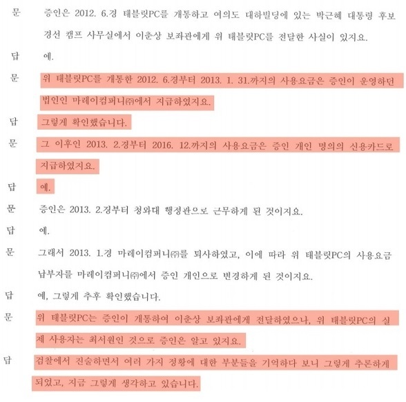 그러면서 “검찰과 김한수가 질의응답을 주고 받은 진술조서, 법정증언에 (실제로는 존재하지도 않는) 저 통신요금 납부기록은 거듭해서 언급이 되고 있는 얘기”라며 “그럼에도 불구하고 귀하는 저 납부기록의 실제 존재 여부에 대해서는 고의건 태만이건 확인을 하지 않았다”고 지적했다. 이로써 김한수의 거짓 알리바이는 공인을 받게 됐다. 결과적으로, ‘최순실 태블릿’은 개통자가 김한수임은 물론 심지어 통신요금 일체 납부자도 김한수임에도 불구하고, 사용자이자 소유주는 최서원이 되어버리는 상식 이하의 일이 벌어졌다.